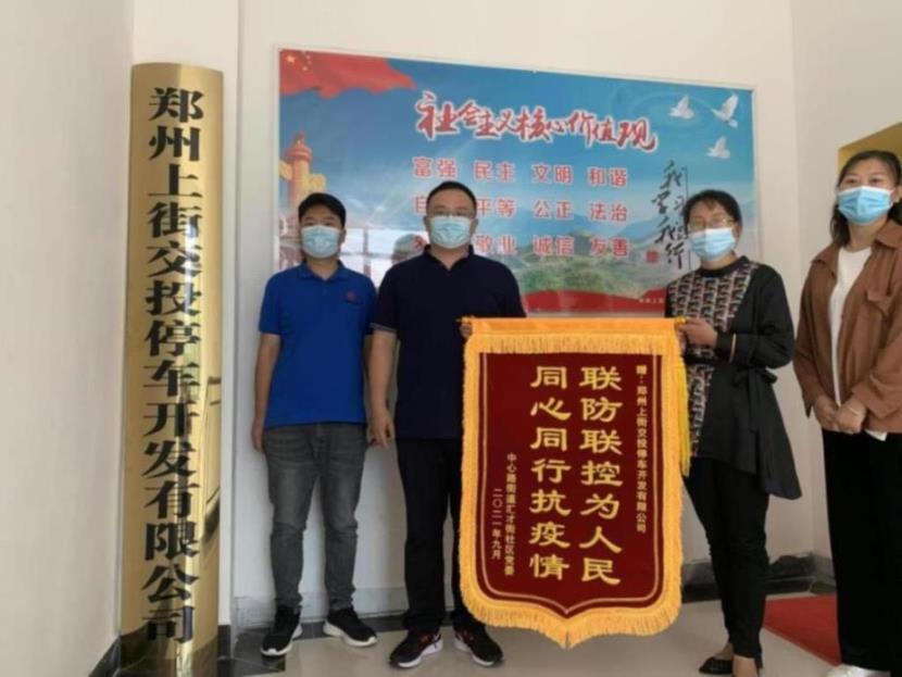 9月2日,上街交投停車公司收到鄭州市上街區(qū)中心路街道辦事處匯才社區(qū)贈(zèng)送的寫有“聯(lián)防聯(lián)控為人民,同心同行抗疫情”的錦旗。社區(qū)書記白晶代表社區(qū)工作人員和廣大居民對(duì)停車公司的志愿者們?cè)谛鹿诜窝滓咔榉揽仄陂g沖鋒在前,積極參與宣傳防疫知識(shí)、維護(hù)核酸檢測現(xiàn)場秩序、幫助社區(qū)做好疫情防控工作所做出的努力表示感謝。