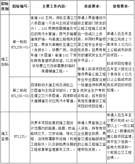 2.4招標(biāo)編號(hào)、招標(biāo)內(nèi)容、資質(zhì)要求、業(yè)績(jī)要求及標(biāo)段劃分;施工劃分2個(gè)標(biāo)段、施工監(jiān)理劃分1個(gè)標(biāo)段。